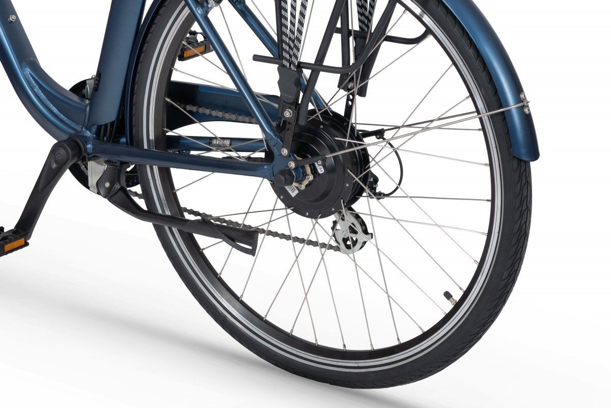 Napęd bazuje na sprawdzonym silniku Bafang umieszczonym w tylnej piaście, który generuje moc 250 W i moment obrotowy 45 Nm, zapewniając płynne wspomaganie nawet na podjazdach. Bateria o pojemności 522 Wh z zastosowanym systemem Smart BMS gwarantuje efektywne zarządzanie energią i wysoką żywotność, a zasięg do 140 km pozwala na długie miejskie wyprawy bez obaw o szybkie rozładowanie. Ładowanie trwa od 6 do 9 godzin.