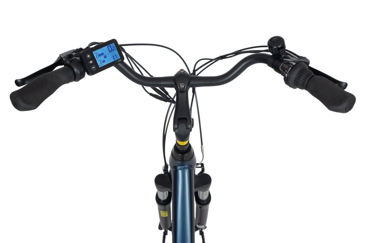 Wyposażenie uzupełnia kolorowy wyświetlacz LCD z szerokim zakresem funkcji i portem USB do ładowania smartfona oraz komplet oświetlenia Spanninga (przednia lampka Kendo XE i tylna RL1900 XE), który jest zasilany z baterii bagażnikowej. Ergonomiczny kokpit z kierownicą Promax HB-T320, wygodnymi chwytami VELO, regulowanym mostkiem i siodłem Selle Royal Basic zapewnia komfort podczas codziennych dojazdów i weekendowych przejażdżek. Dzięki niższemu przekrokowi i męskiemu wariantowi rower trafia do szerokiego grona użytkowników poszukujących stylowego, funkcjonalnego e-bike'a na miejski teren.