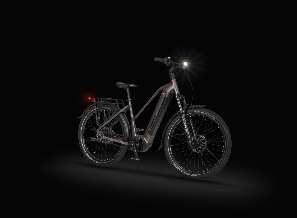 Na pokładzie Ecobike Dare znajdziemy także hydrauliczne hamulce tarczowe Shimano MT401, ergonomiczną kierownicę Uno, chwyty Herrmans Nucore oraz komfortowe siodło Velo VL-3625 umieszczone na aluminiowej sztycy UNO. Gridę funkcjonalności dopełniają fabrycznie montowane błotniki, system mocowania sakw MIK, zintegrowane oświetlenie LED (przód Herrmans MR5, tył Spanninga GLOW XE) oraz wygodny bagażnik, co czyni Dare idealnym wyborem nie tylko na codzienne dojazdy, ale i na długodystansowe przygody. Rower wytrzymuje obciążenie do 125kg, a jego masa zależnie od rozmiaru ramy waha się od 29kg do 29.6kg.