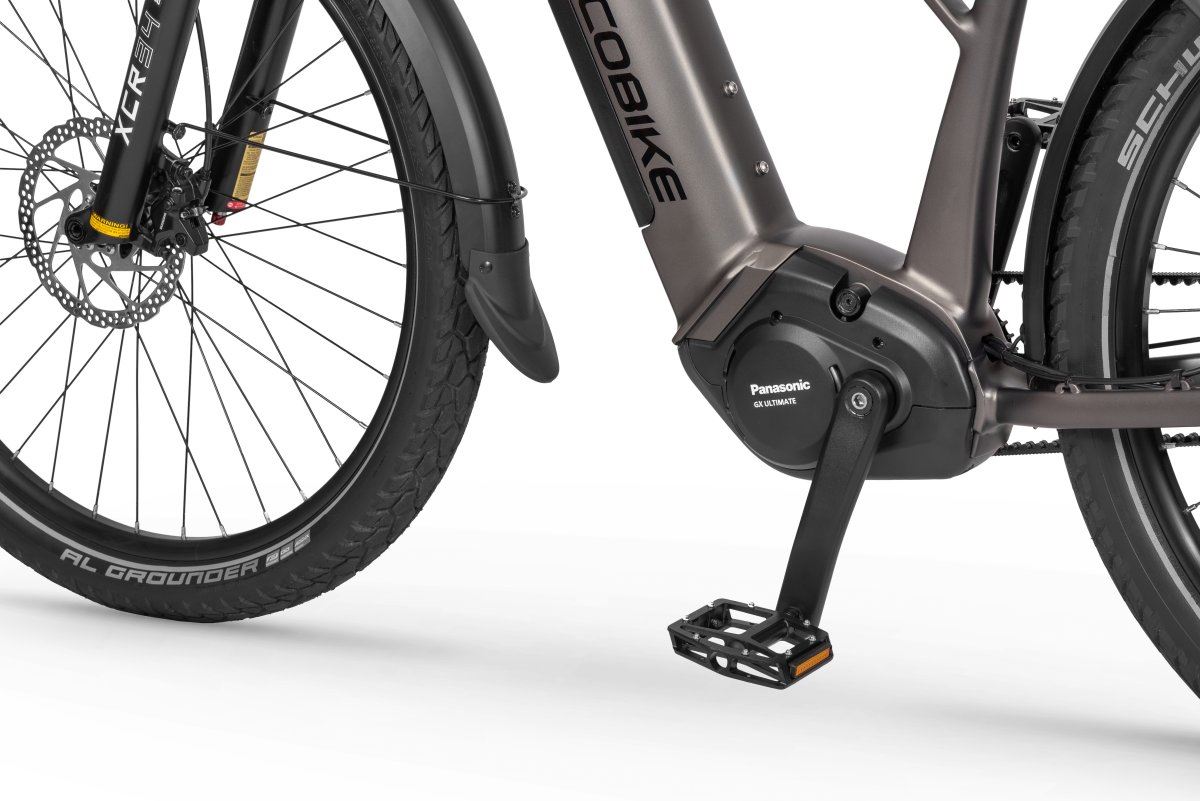Ecobike Dare to flagowy model klasy trekkingowej, który łączy technologie premium z minimalistycznym podejściem do konstrukcji ramy. Zastosowany centralny silnik Panasonic GX Ultimate (250W, 95Nm, 36V) w duecie ze zintegrowanym kontrolerem Panasonic i czujnikiem siły nacisku daje naturalne, płynne oraz błyskawicznie dostępne wspomaganie, pozwalając pewnie pokonywać zarówno miejskie, jak i terenowe trasy. Zaletą napędu jest wyjątkowa niezawodność, cichość pracy i szybkie przekazywanie mocy na koła dzięki bezobsługowemu paskowi Gates Carbon Drive CDX, który zamiast tradycyjnego łańcucha gwarantuje czystość, wytrzymałość i minimalne wymagania serwisowe nawet do 20,000km użytkowania.